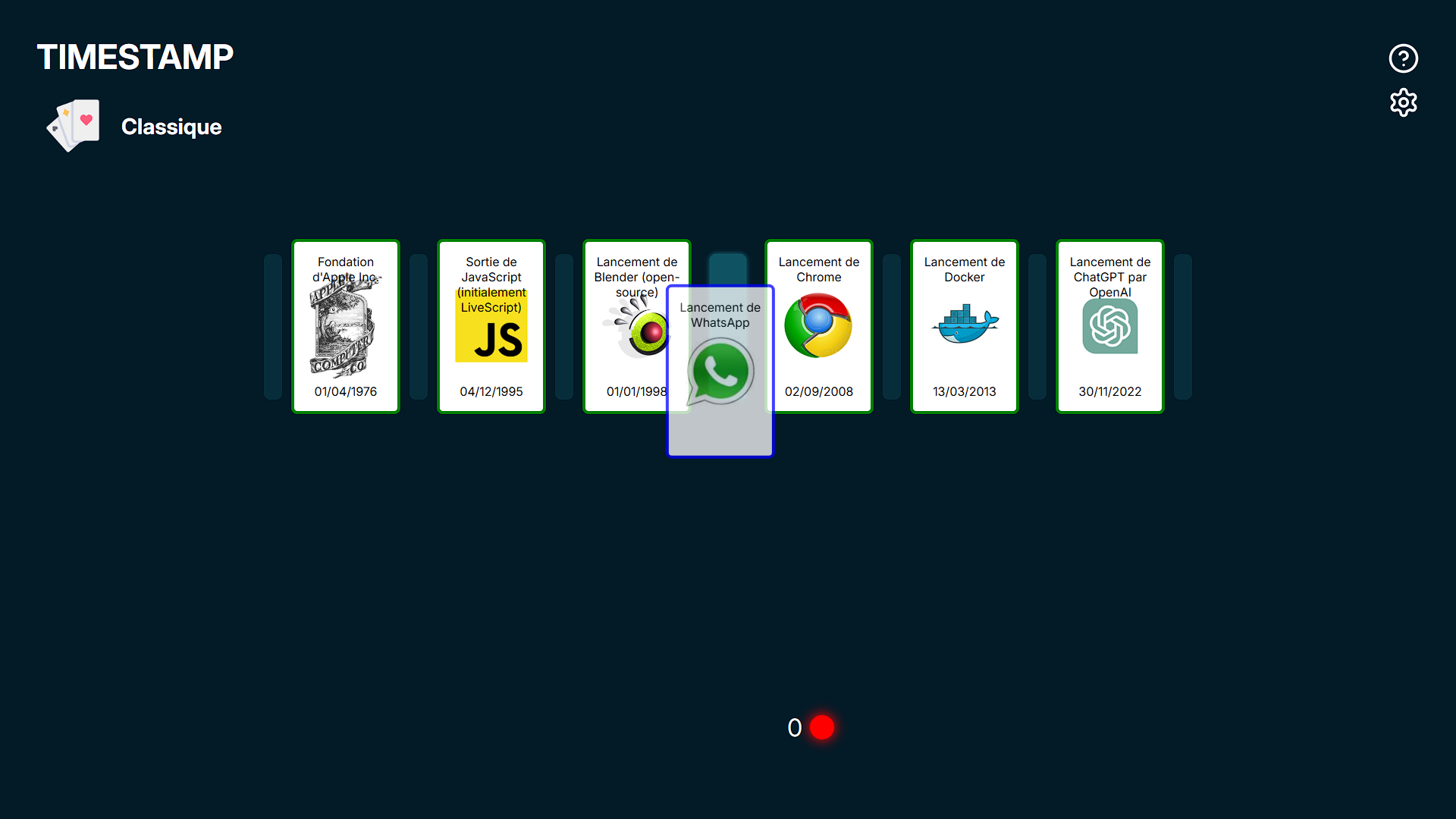Ce projet a été réalisé dans le cadre d'un projet de cours en groupe en duo. Nous devions créer un serious game inspiré du jeu de plateau Timeline. Pour le développer, nous avons utilisé les frameworks Symfony pour l'API REST et React pour le front-end. .