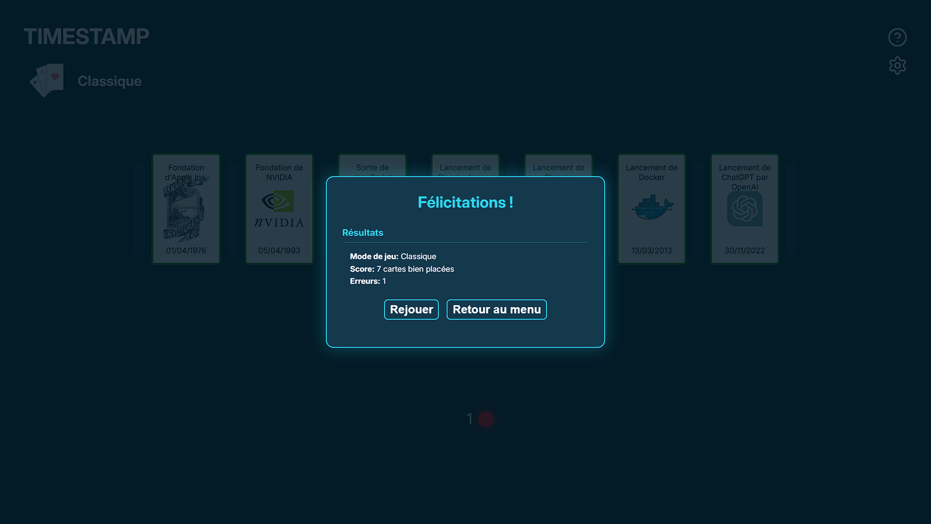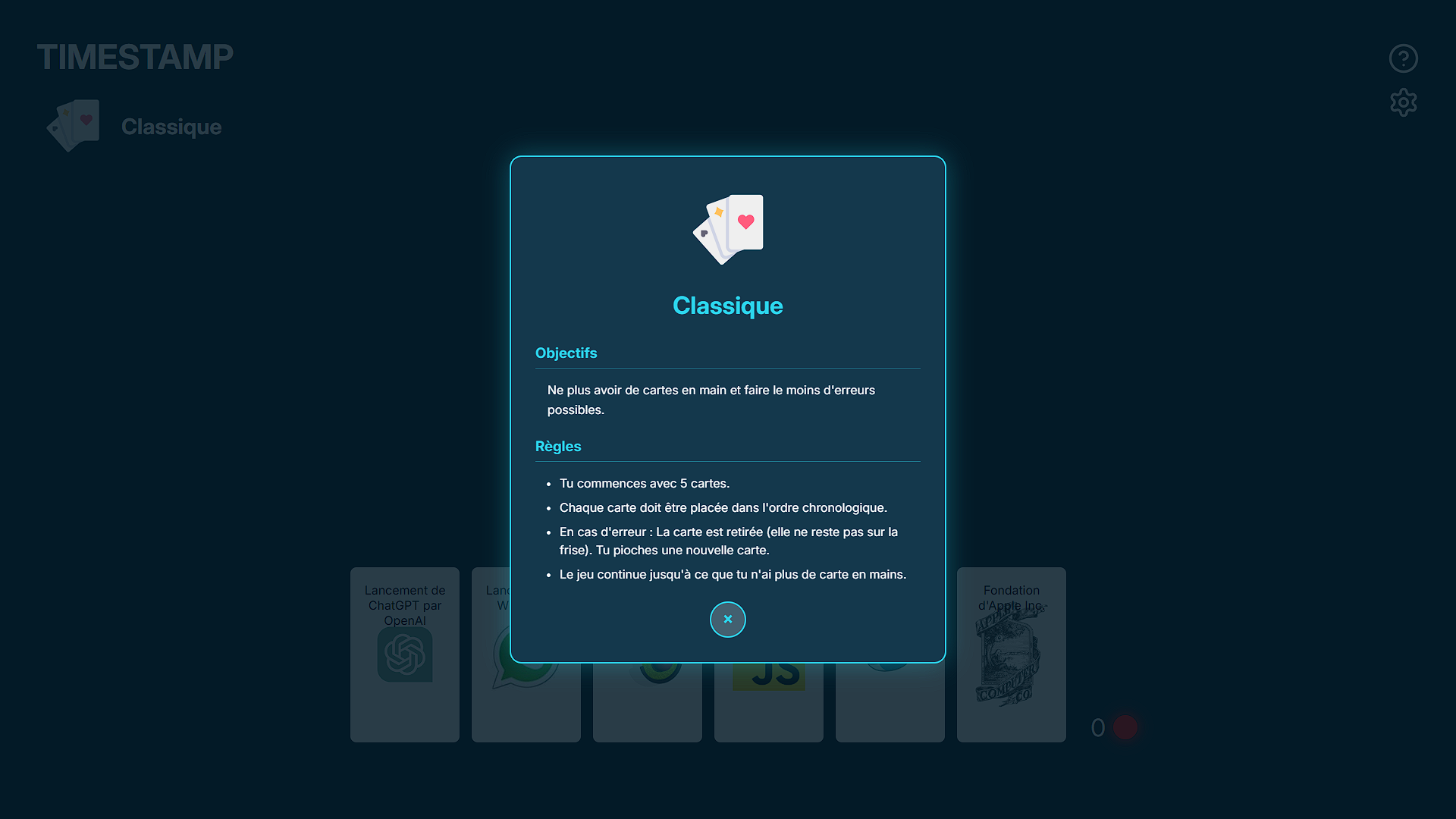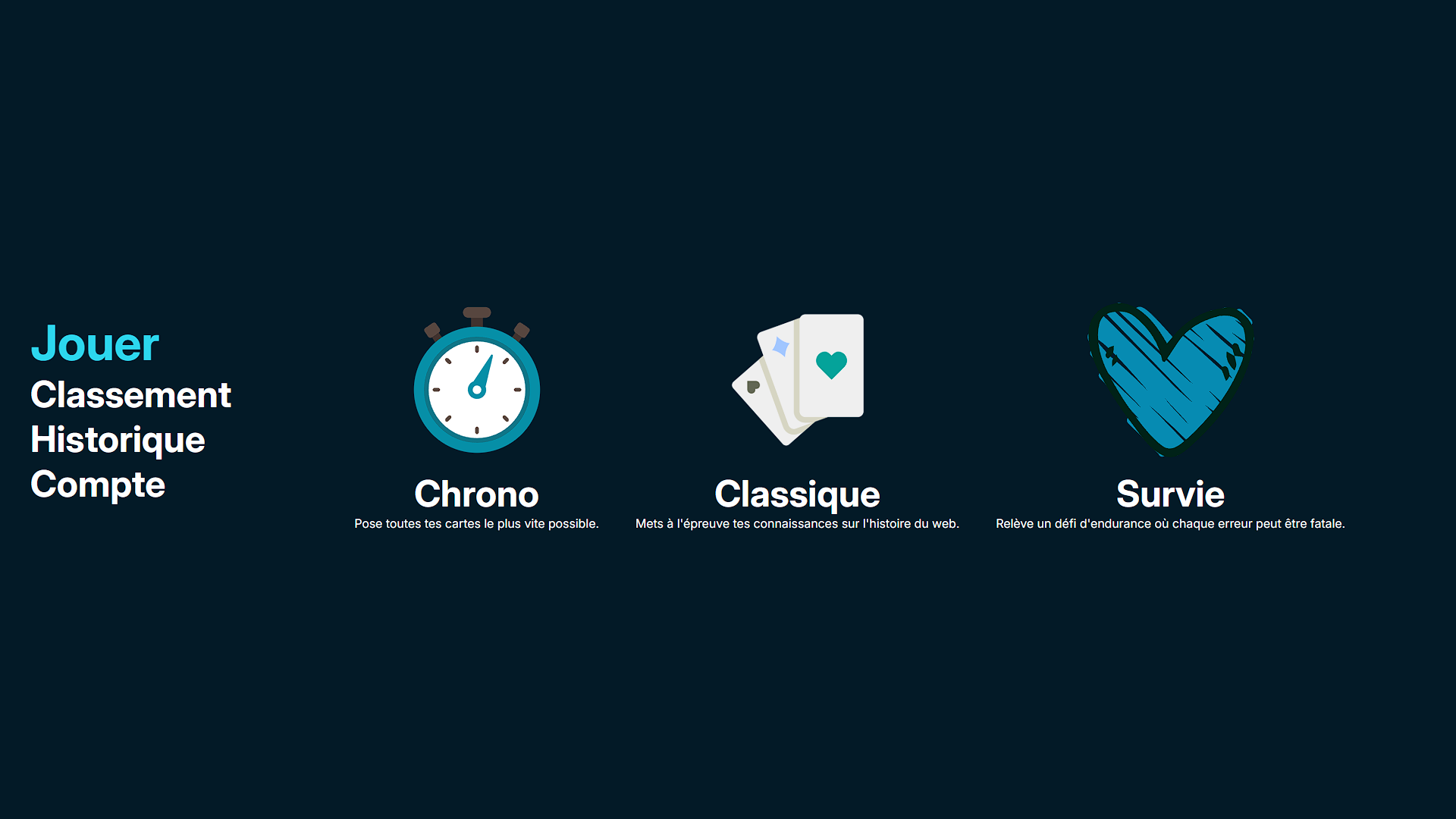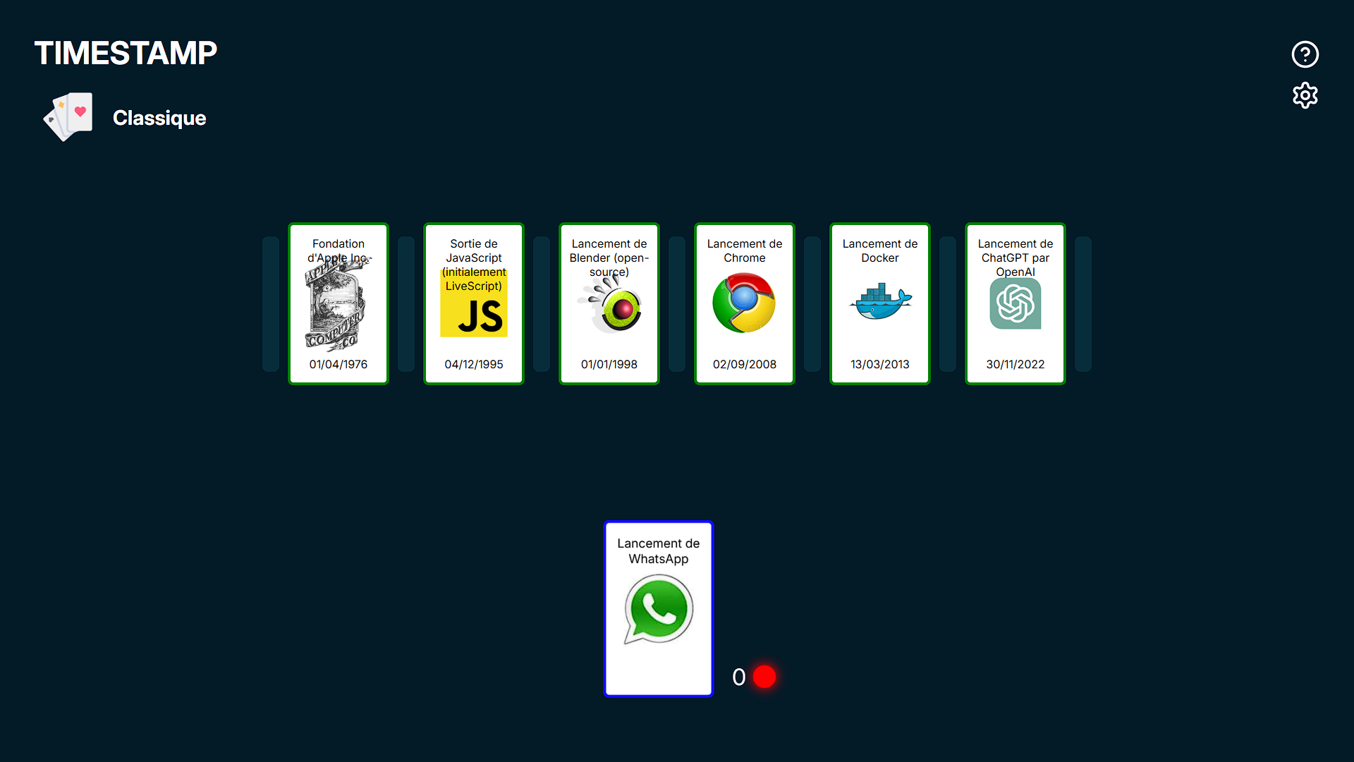 Ce projet a été réalisé dans le cadre d'un projet de cours en groupe en duo. Nous devions créer un serious game inspiré du jeu de plateau Timeline. Pour le développer, nous avons utilisé les frameworks Symfony pour l'API REST et React pour le front-end. .