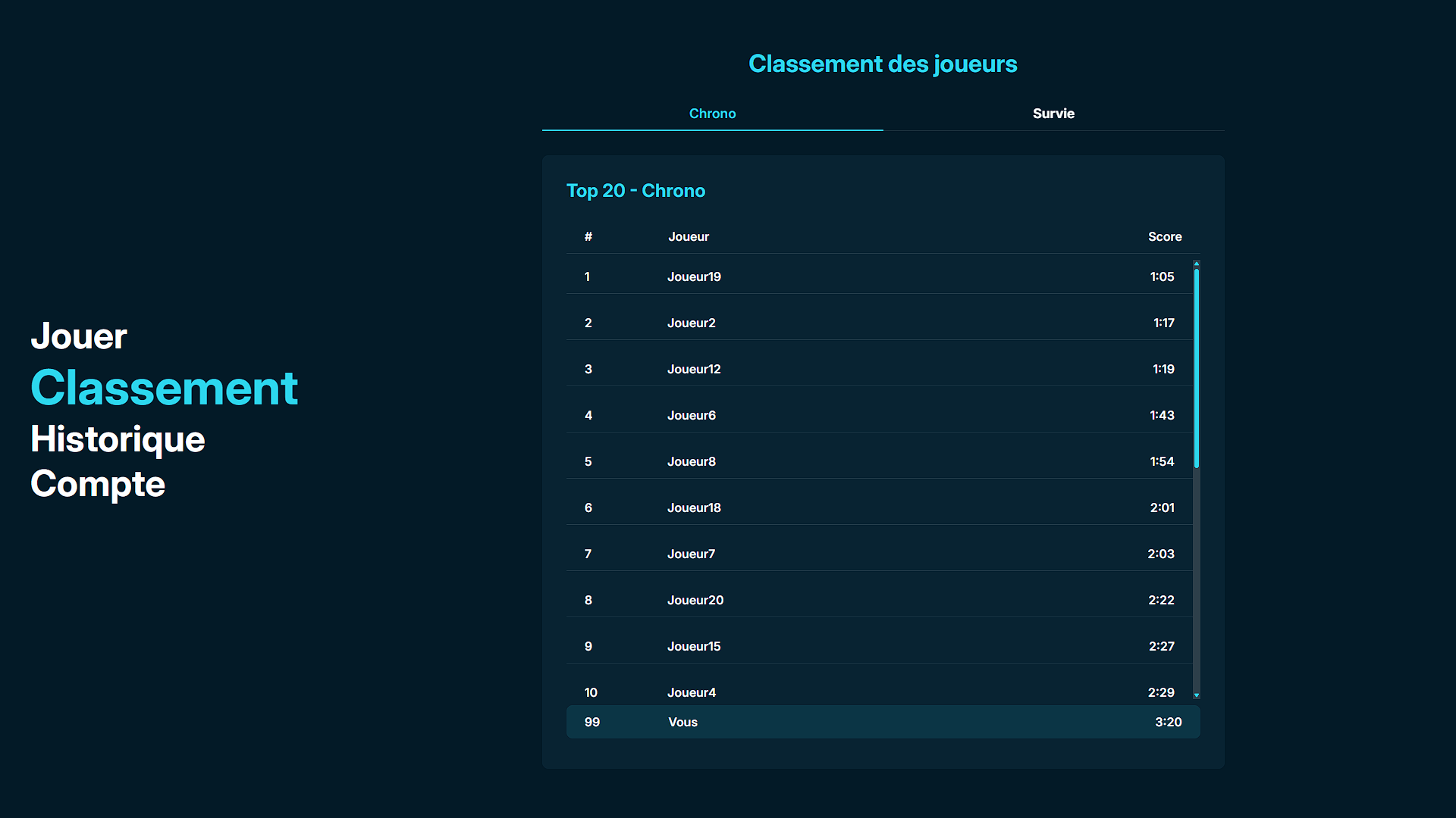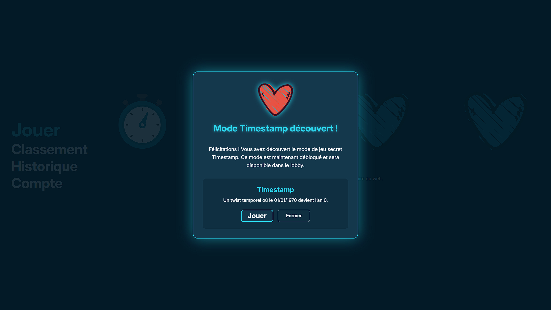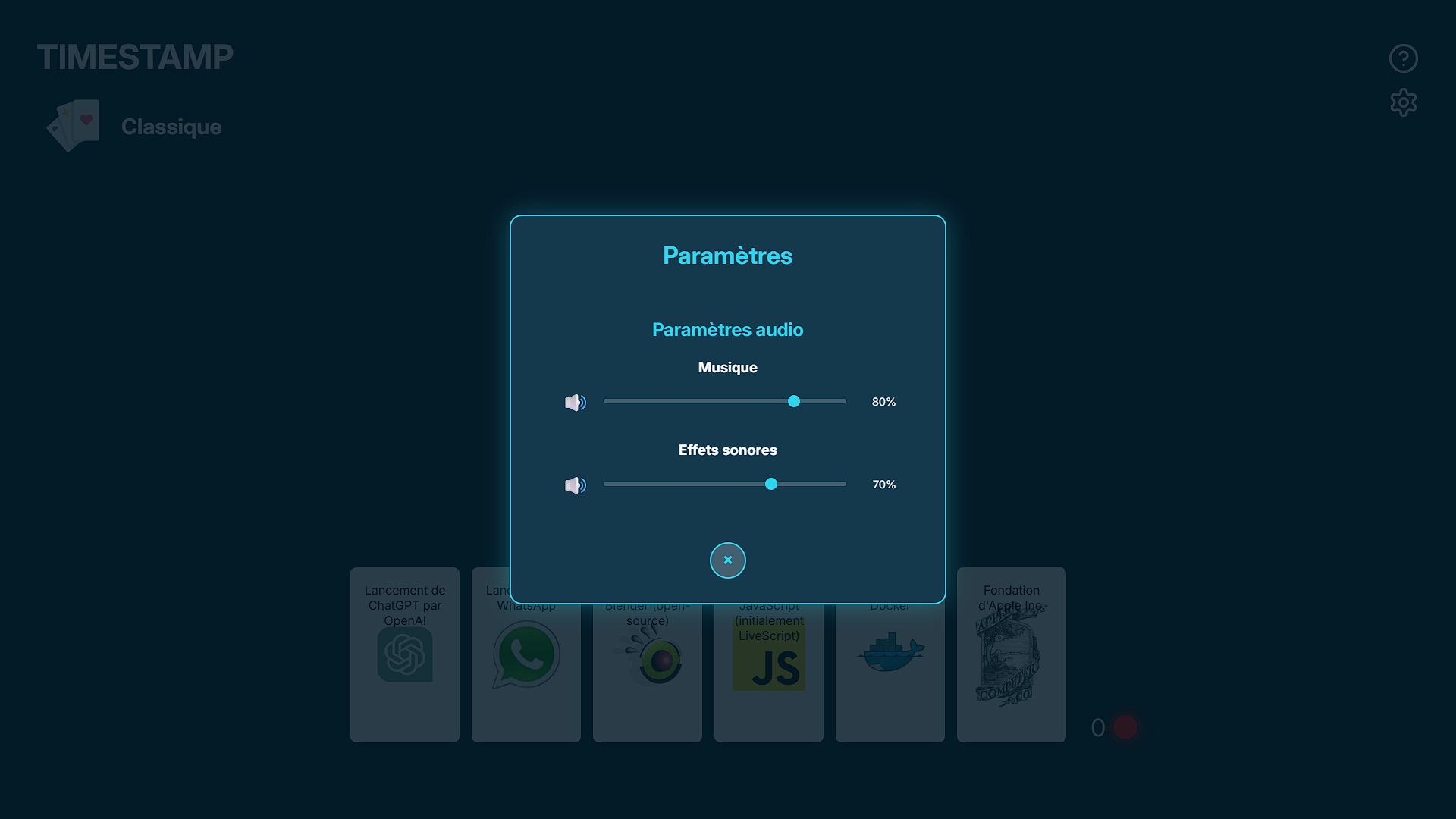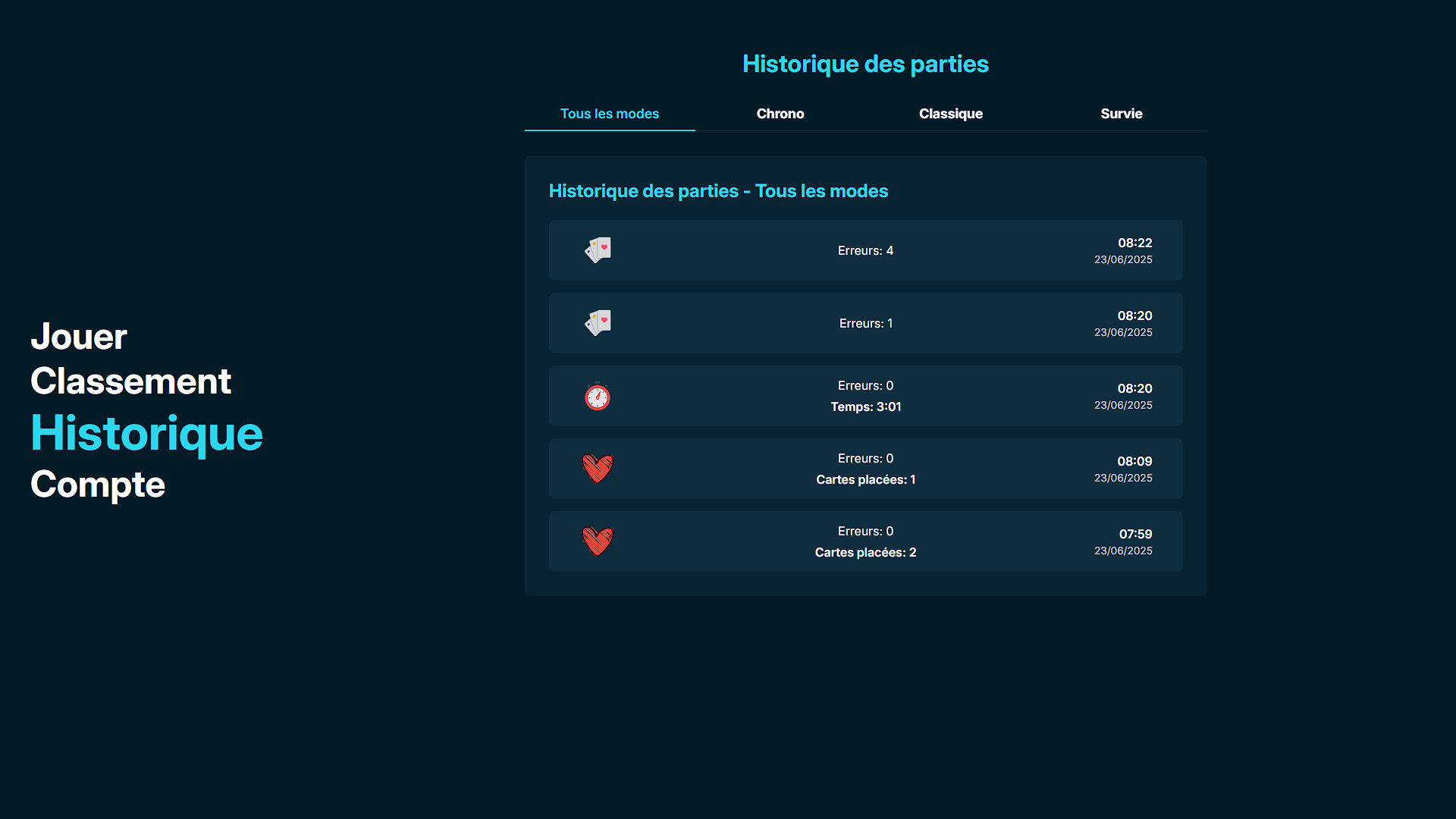 Ce projet a été réalisé dans le cadre d'un projet de cours en groupe en duo. Nous devions créer un serious game inspiré du jeu de plateau Timeline. Pour le développer, nous avons utilisé les frameworks Symfony pour l'API REST et React pour le front-end. .